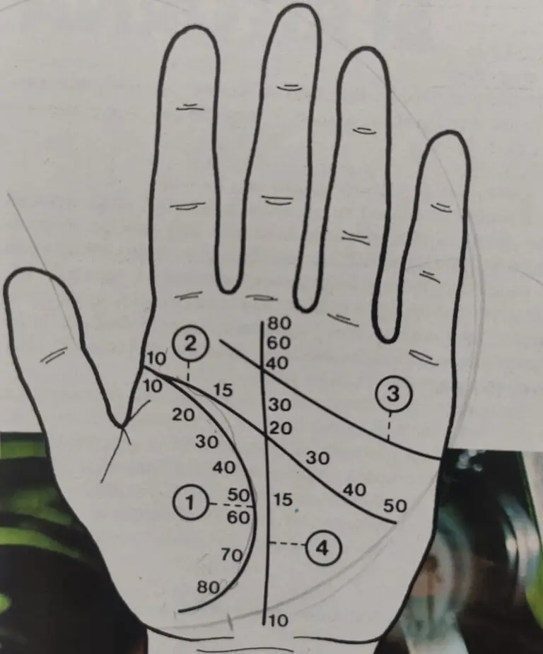 “Prendete un compasso, fissate il perno alla base del dito indice come centro, estendete l’altra sbarretta fino alla metà della base dell’anulare. Tracciate un tratto di cerchio e segnate questa distanza sulla linea della Vita. La parte della linea compresa tra il lato più in alto della mano e il punto così determinato rappresenterà i primi dieci anni di vita. Quindi, estendete il punto mobile fino alla divisione tra l’anulare e il mignolo, e la distanza cosi trovata sulla linea della vita determinerà il ventesimo anno di vita e, quindi, lo spazio compreso tra il primo e il secondo punto costituirà la vita compresa tra i dieci e i vent’anni. Il punto mobile esteso fino alla metà del mignolo, alla sommità della mano e alla radice del mignolo, alla percussione del palmo dove si incrocia con la linea del Cuore, daranno rispettivamente nella loro corrispondenza con la linea della Vita – i trenta, i quaranta e cinquant’anni.