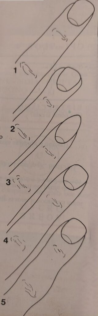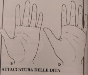 L’attaccatura del medio, si sa, è la più alta. Dunque da essa si stabilirà il “livello” di inserzione delle altre dita nel palmo della mano.