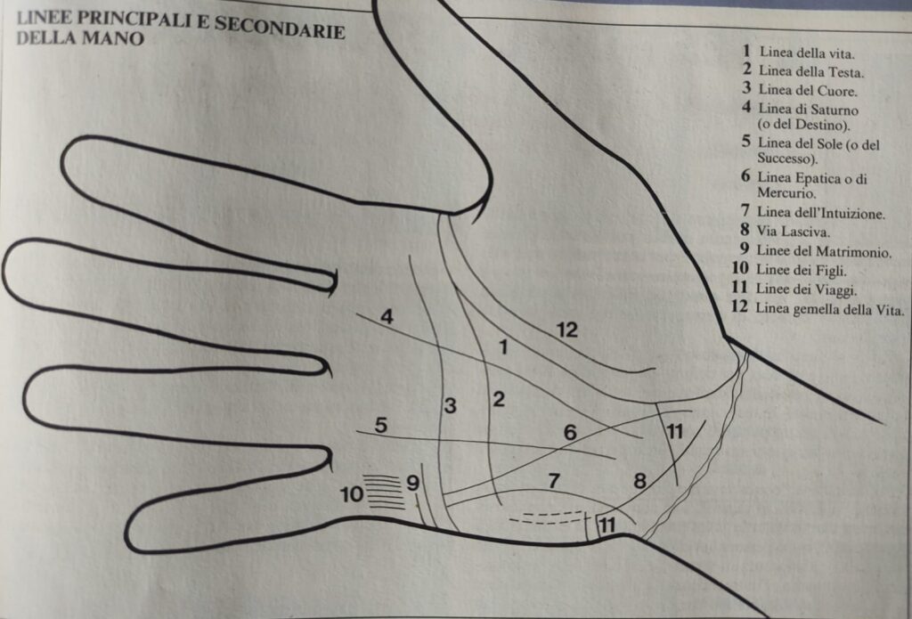 L’analisi delle linee della mano ha finora considerato la linea della Vita, della Testa e del Cuore (principali), nonché la linea di Saturno, del Sole ed Epatica (indicata come secondarie maggiori).