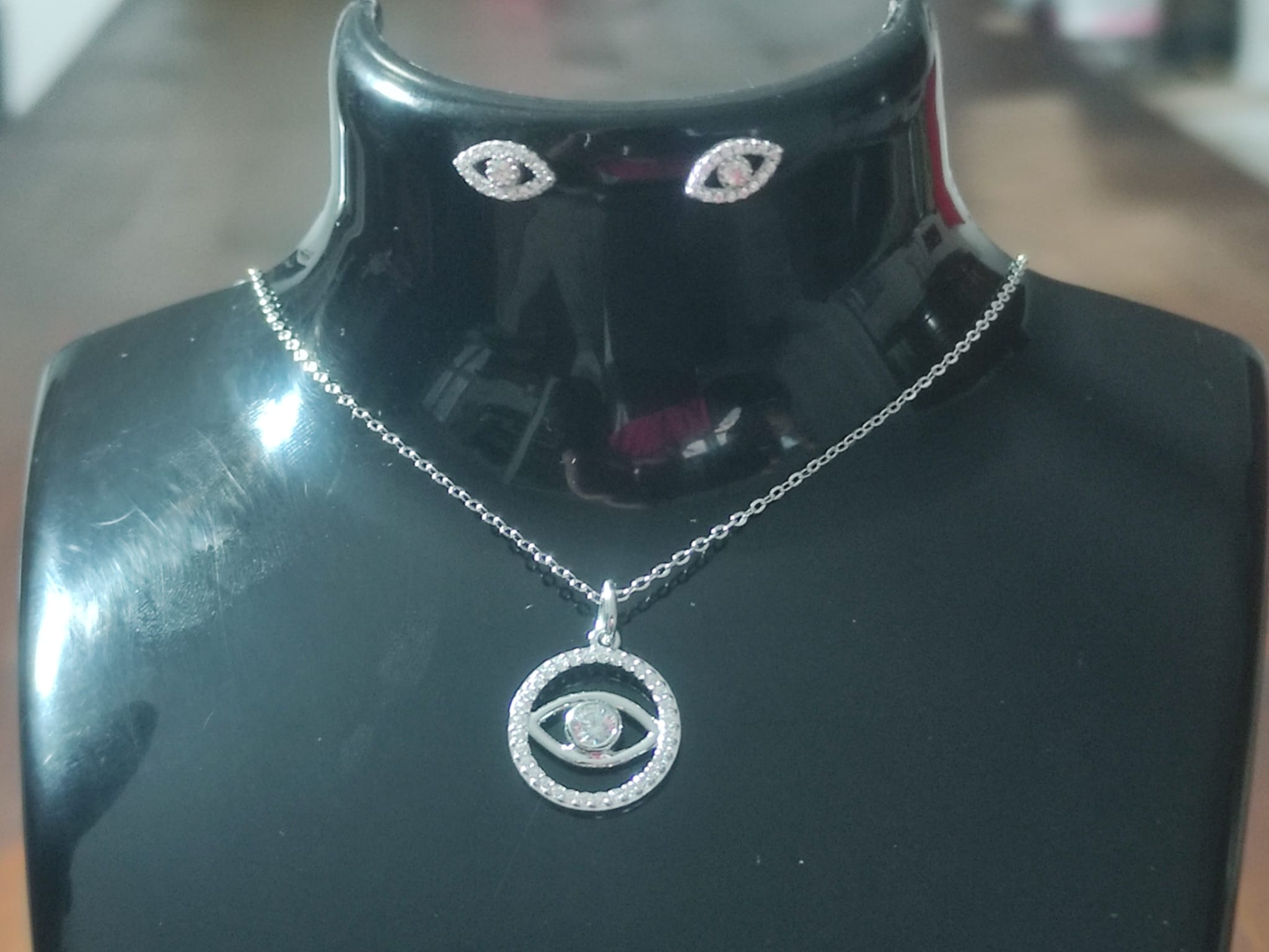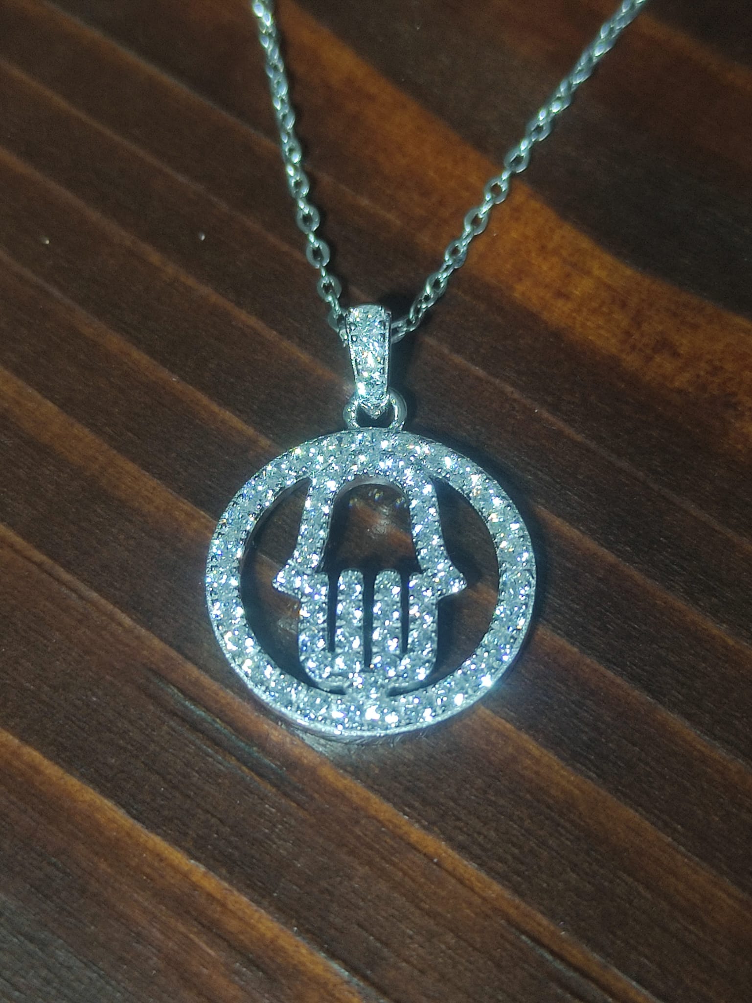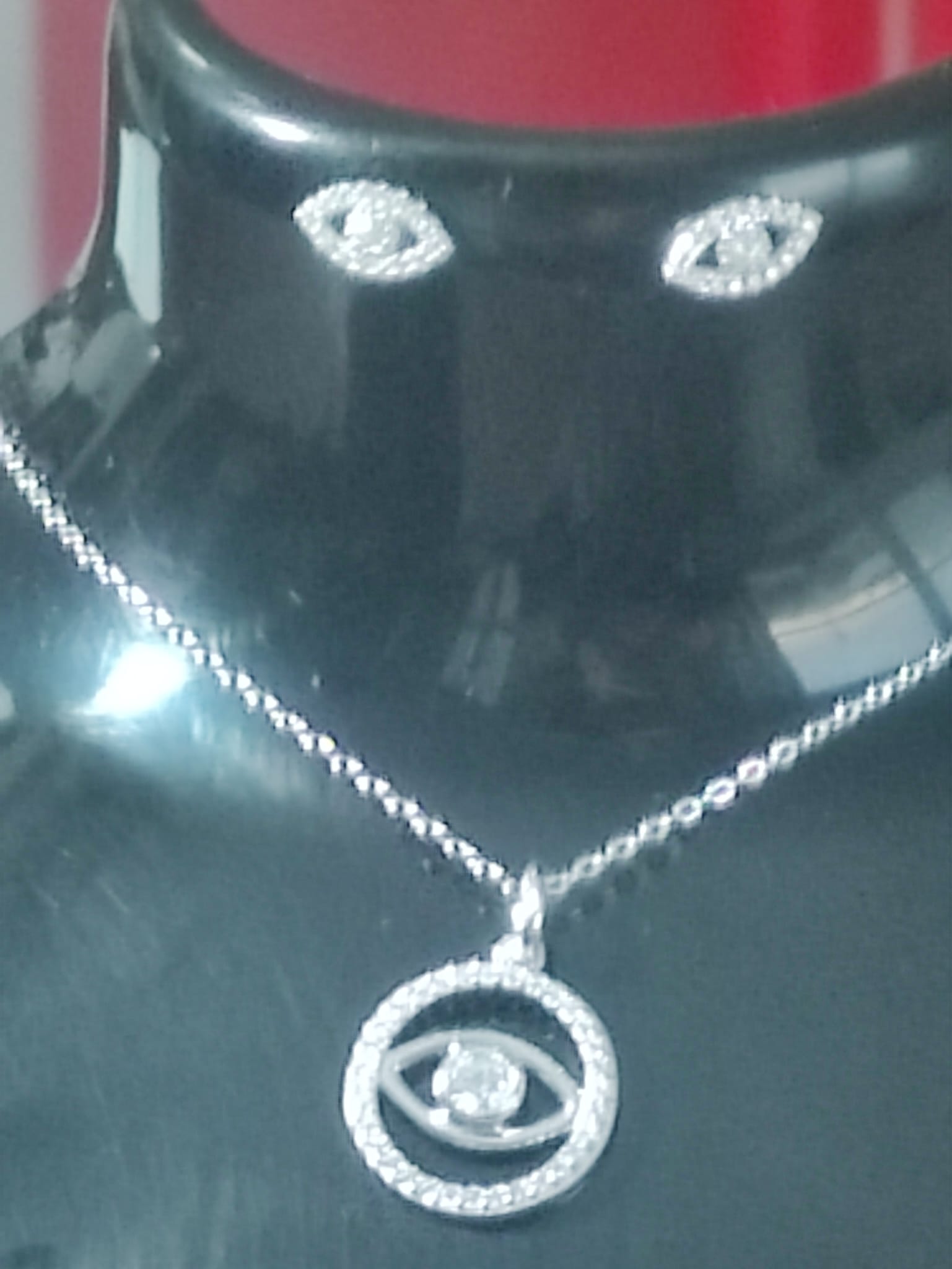 Il ciondolo è a forma di cerchio, e la sua catena, sono in argento, grammi 2,56 e senza nickel, con 32 pietre di 1,25 mm zircone bianco rotondo, e pietra centrale di 4 mm in zircone bianco rotondo.