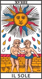 La carta del Sole raffigura due fanciulli nudi al di qua di una costruzione muraria, sotto un grande disco solare. Questi fanciulli, simboli delle due polarità maschile e femminile, rappresentano l’unione di Yesod. Il muro dorato rappresenta la sacralità dell’ambiente in cui avviene la reazione alchemica.